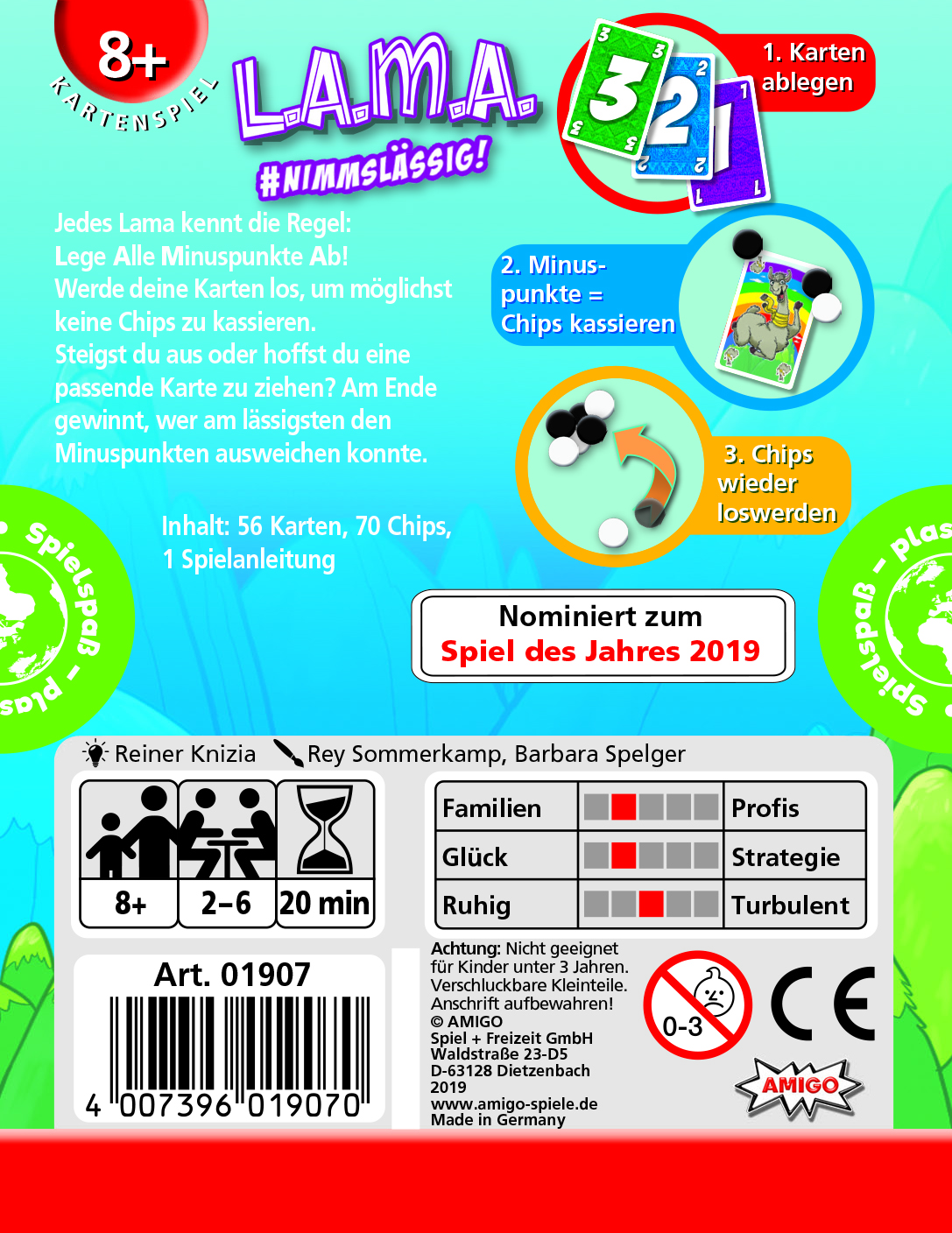 Der Name ist Programm, denn jedes Lama kennt die Regel: Lege Alle Minuspunkte Ab! Werde deine Karten los, um so möglichst keine Chips zu kassieren. Steigst du aus, oder hoffst du eine passende Karte zu ziehen? Am Ende gewinnt, wer am lässigsten den Minuspunkten ausweichen konnte.